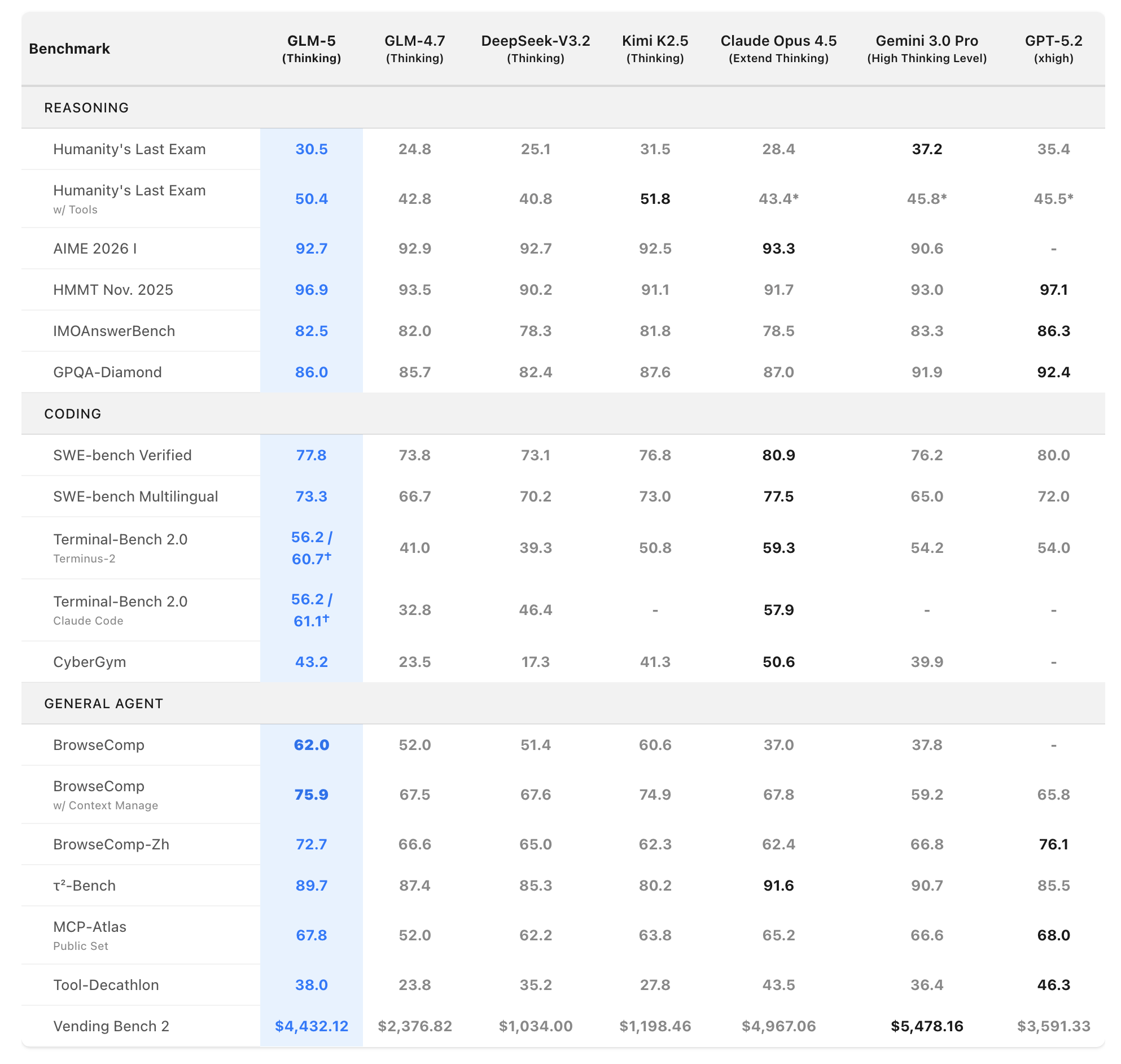 temperature=1.0, top_p=0.95, max_new_tokens=131072). By default, we report the text-only subset; results marked with * are from the full set. We use GPT-5.2 (medium) as the judge model. For HLE-with-tools, we use a maximum context length of 202,752 tokens.temperature=0.7, top_p=0.95, max_new_tokens=16384, with a 200K context window.timeout=2h, temperature=0.7, top_p=1.0, max_new_tokens=8192, with a 128K context window. Resource limits are capped at 16 CPUs and 32 GB RAM.temperature=1.0, top_p=0.95, max_new_tokens=65536. We remove wall-clock time limits due to generation speed, while preserving per-task CPU and memory constraints. Scores are averaged over 5 runs. We fix environment issues introduced by Claude Code and also report results on a verified Terminal-Bench 2.0 dataset that resolves ambiguous instructions (see: https://huggingface.co/datasets/zai-org/terminal-bench-2-verified).temperature=1.0, top_p=1.0, max_new_tokens=32000) and a 250-minute timeout per task. Results are single-run Pass@1 over 1,507 tasks.